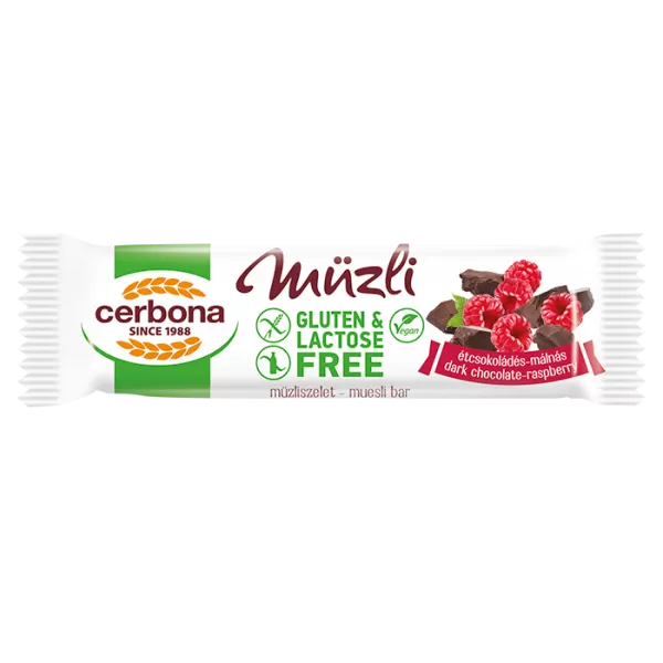 A Cerbona Gluténmentes étcsokis-málnás müzliszeletet kukoricából készítjük, mely természetesen gluténmentes. Málnát és étcsokoládét adunk hozzá, majd szeletté formázzuk. Termékünk elkészítése során csak laktózmentes alapanyagokat használunk.